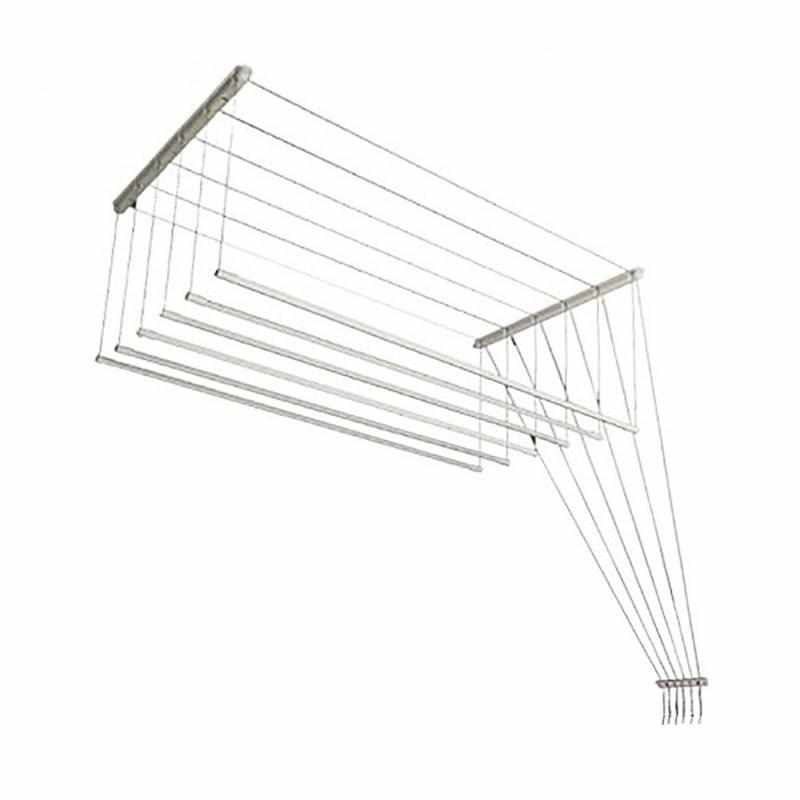 Konstrukcja suszarki opiera się na wytrzymałych metalowych prętach pokrytych powłoką z tworzywa sztucznego, co gwarantuje pełną odporność na wilgoć oraz zabezpiecza tkaniny przed zaciągnięciem czy zabrudzeniem. Intuicyjny system sznurkowy pozwala na indywidualne opuszczanie każdego pręta na dowolną wysokość, co znacznie ułatwia wieszanie odzieży bez konieczności nadwyrężania rąk i kręgosłupa. Po zawieszeniu prania, jednym ruchem podciągasz je pod sufit, gdzie ciepłe powietrze gromadzi się naturalnie, przyspieszając proces schnięcia.