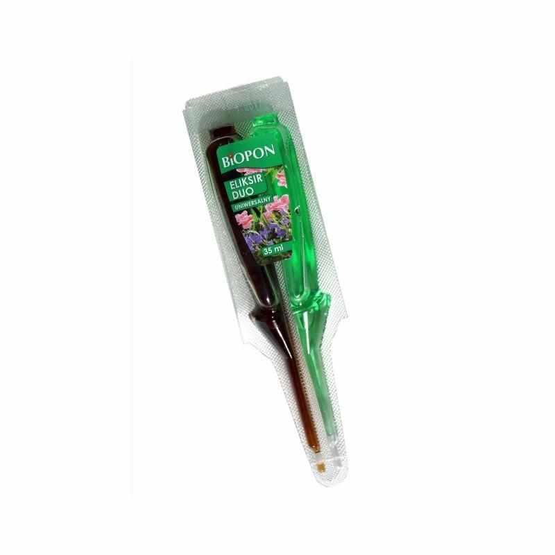 Aplikacja Eliksiru DUO jest niezwykle prosta i nie wymaga żadnych narzędzi. Należy odciąć końcówkę aplikatora w miejscu nacięcia, a następnie umieścić go pionowo w ziemi w doniczce tak, aby płyn mógł swobodnie wypływać do podłoża. Eliksir będzie samoczynnie dozował odpowiednią ilość preparatu. Po opróżnieniu aplikatora (co trwa zazwyczaj od kilku do kilkunastu dni w zależności od struktury ziemi), substancje odżywcze pozostają aktywne w glebie przez kolejne tygodnie. Produkt idealnie sprawdza się zarówno u roślin kwitnących, jak i tych o ozdobnych liściach, stanowiąc doskonałą kurację wzmacniającą.