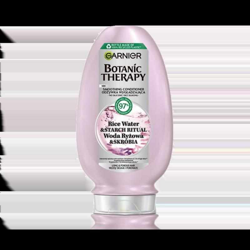 Formuła serii Botanic Therapy łączy w sobie dobroczynne właściwości wody ryżowej oraz skrobi kukurydzianej. Woda ryżowa jest znana z właściwości zatrzymywania wilgoci wewnątrz włókna włosa, natomiast skrobia działa jak naturalna bariera wygładzająca, która domyka łuski. Dzięki temu produkt zapewnia efekt 72-godzinnego blasku i miękkości, co zostało potwierdzone testami instrumentalnymi. Co niezwykle istotne w codziennej pielęgnacji, odżywka posiada w 97% skład pochodzenia naturalnego i jest całkowicie pozbawiona silikonów, co pozwala włosom oddychać.