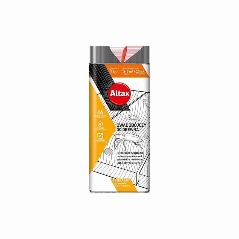 Sposób użycia: Przed aplikacją należy usunąć z drewna wszelkie powłoki lakiernicze lub malarskie, aby umożliwić wniknięcie płynu. Preparat nanosi się pędzlem poprzez obfite smarowanie lub metodą wstrzykiwania bezpośrednio w otwory żerowania przy pomocy strzykawki. W przypadku zwalczania owadów, zaleca się zużycie około 0,3 litra produktu na 1 m² powierzchni drewna. Po aplikacji należy odczekać do całkowitego wyschnięcia przed nałożeniem produktów dekoracyjnych. Zadbaj o bezpieczeństwo swojej konstrukcji i zaufaj ekspertom z marki Altax.