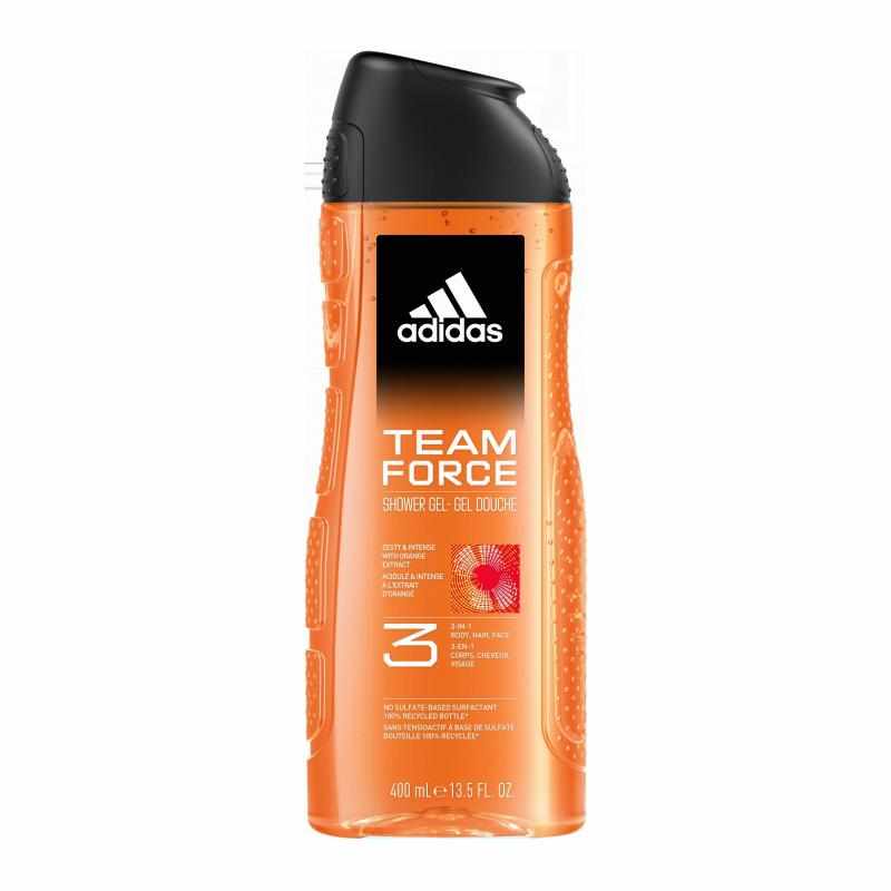 Sercem formuły są naturalne olejki eteryczne z pomarańczy oraz paczuli. To połączenie nie tylko tworzy męski, cytrusowy aromat, ale również wpływa na poprawę nastroju i regenerację po wysiłku. Żel Adidas Team Force wyróżnia się nowoczesnym, świadomym podejściem do składu – otrzymujesz wegańską formułę przebadaną dermatologicznie, która jest łagodna dla skóry i nie powoduje jej przesuszenia. Adidas stawia także na ekologię: butelka została wykonana w 100% z materiałów pochodzących z recyklingu, co pozwala Ci dbać o siebie w zgodzie z naturą.